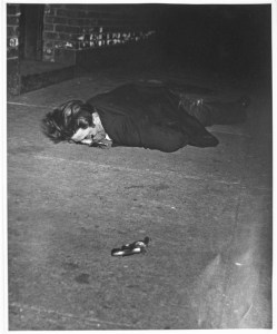 Murder in Hell’s Kitchen is a photo that makes me think for a multitude of reasons. The first reason being that it is such a macabre image; it’s a man who has been shot in the face. Another question the photo makes me ask is, who is this man? If I didn’t know the title of the photo I would still be able to tell that he is a murder victim because of the gun that is on the floor facing towards him. The photo kind of desensitises me to the fact that the victim is dead because it’s shot in black and white; I know that it is blood on the man’s face, however, it just looks like a black mark because I cant see any of the red tones. I like how the photo fades to black in the background, engulfing the man’s body and it gives a sense of the unknown which is a good metaphor for death. On the flipside of that, there is quite a lot of detail and light in the foreground from Weegee’s perspective.
