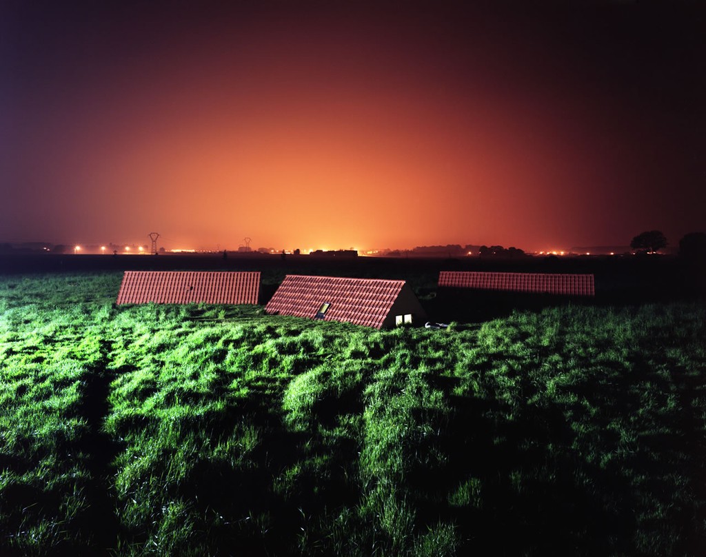 This photograph is by French photographer David De Beyter. The majority of his work focuses on incorporating large structures and sculptures he designs and creates beforehand. This photograph in particular features three tiled buildings which appear to be half “sunk” into the ground. The location of the photograph is based primarily in a large field in front of some sort of small town which is lighting up the dark night sky with a warm glow.